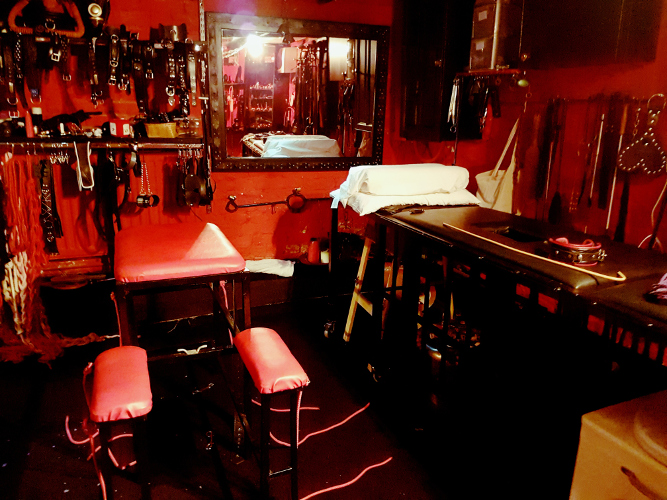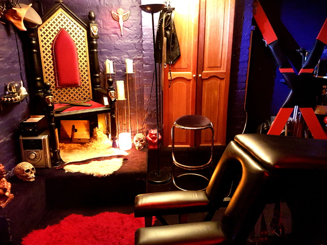 large bed with built-in under-cage (for naughty slaves to sleep whilst their Dominant rests on comfort)
